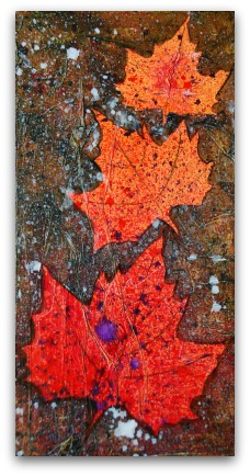 The thinking was to start with the background and then block off the leaf shapes. By painting over the background yet allowing the texture and spatter to still show through would most likely provide a visual feast.