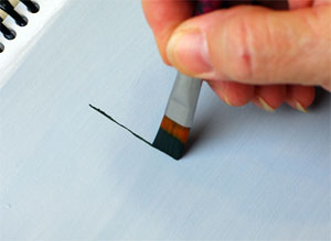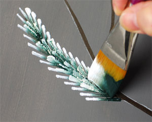 Position the chisel of the brush with the green side touching the branch and the white side pointing out. Start at the base of the branch. Press the brush down leaving a chisel imprint. Move up the branch and as you near the tip pivot the angle of the brush so that the tip tapers. Make your way down the other side.