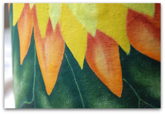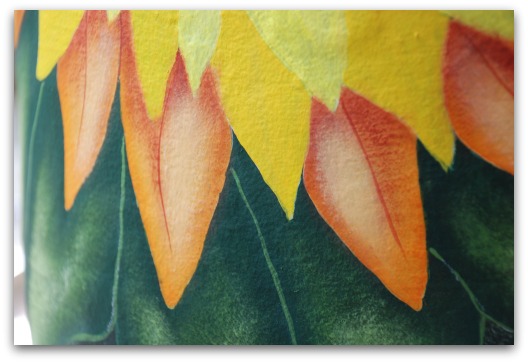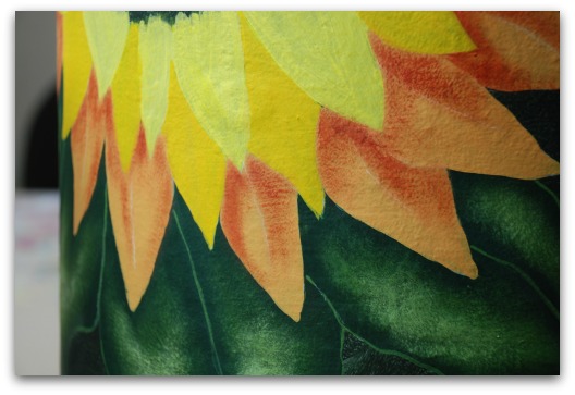The first row of petals, next to the flower center was basecoated with a mix of Bright Yellow + Buttermilk. Bright Yellow is very transparent so by mixing it with a bit of Buttermilk it gave me the brightness I wanted but the opacity I needed. I did 2 coats.