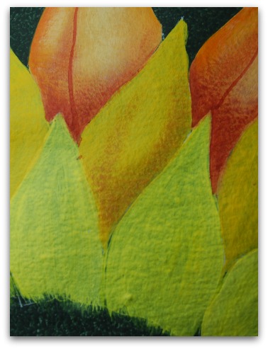 Using the same brush I floated a highlight of Bright Yellow + White mix around the edges of the petals. The highlight on the petals is dry brushed with mix of Bright Yellow + White. The petals are loosely outlined with the same yellow mix.