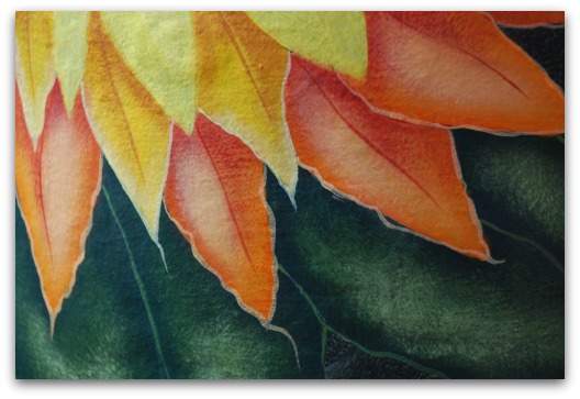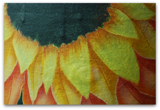 Very choppy wide floats.Using the same brush I floated a highlight of White + Bright Yellow mix around the edges of the petals. The highlight on the petals is dry brushed with mix of White + Bright Yellow. The petals are loosely outlined with the same yellow mix.