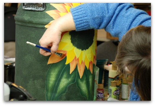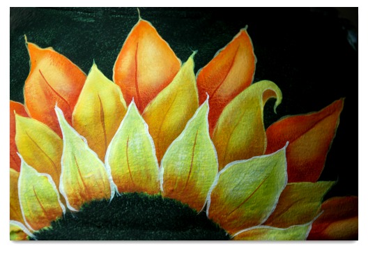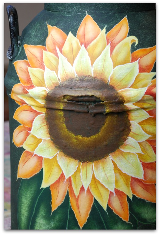 First Sunflower completed!So, you may be taking notes and thinking about how you can do all of this. Don't worry, you will be able to follow my process and my progress as I continue to develop this antique milk can project. And I will publish a detailed step-by-step tutorial at the end of it all so you can paint your very own. As is true of all of my instructional material, it will include everything you need including line drawings, brush selections, paint colors... the works! Who knows... there may even be a video! How cool is that?