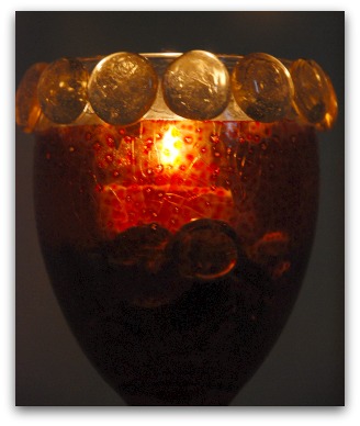 Here I've adhered clear glass beads to the top of the glass where I had masked it off. I knew once I had a candle inside that the clear beads would refract light on nearby walls as shown at the top of this page.
