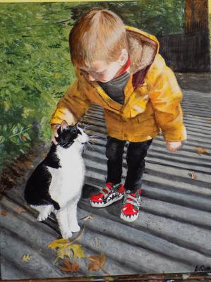 This is a painting of my Grandson who is 3 years old; he was on the way to playgroup/nursery and found Felix the neighbours cat so stroked Felix on the head and as Felix has known him since being a baby he was pleased to greet him and push his head into our Grandsons hand..... Such a cheerful little boy and loved the bright yellow coat, red monster shoes and shadows through the fence cast across the path.