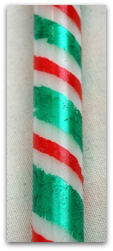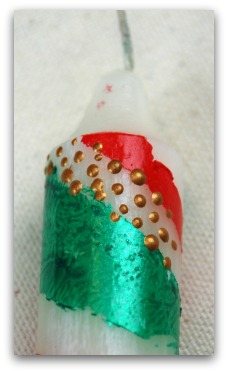 Using Emperor's Gold and the tip of a stylus, add dots between the green and red sections. The dots will remain wet and tender so be careful not to squish them. You may find it easier to put the candle in the holder to do this step.