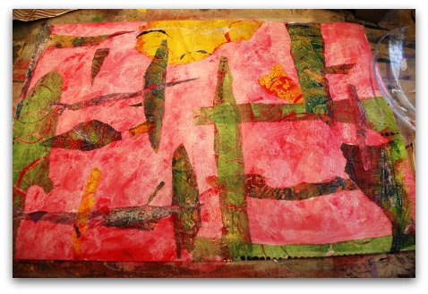 Here I've prepared my watercolor paper by collaging handmade papers and applying washes of red paint. I prefer getting rid of the white background.