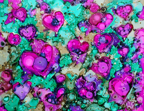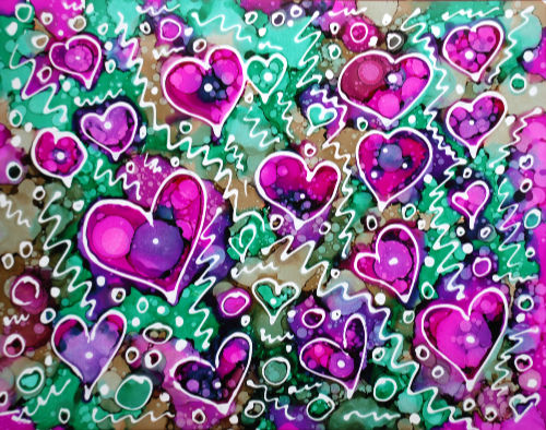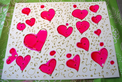 Here I've added drops of Raspberry ink to most of the hearts. I just let the ink drip off the tip of the bottle.